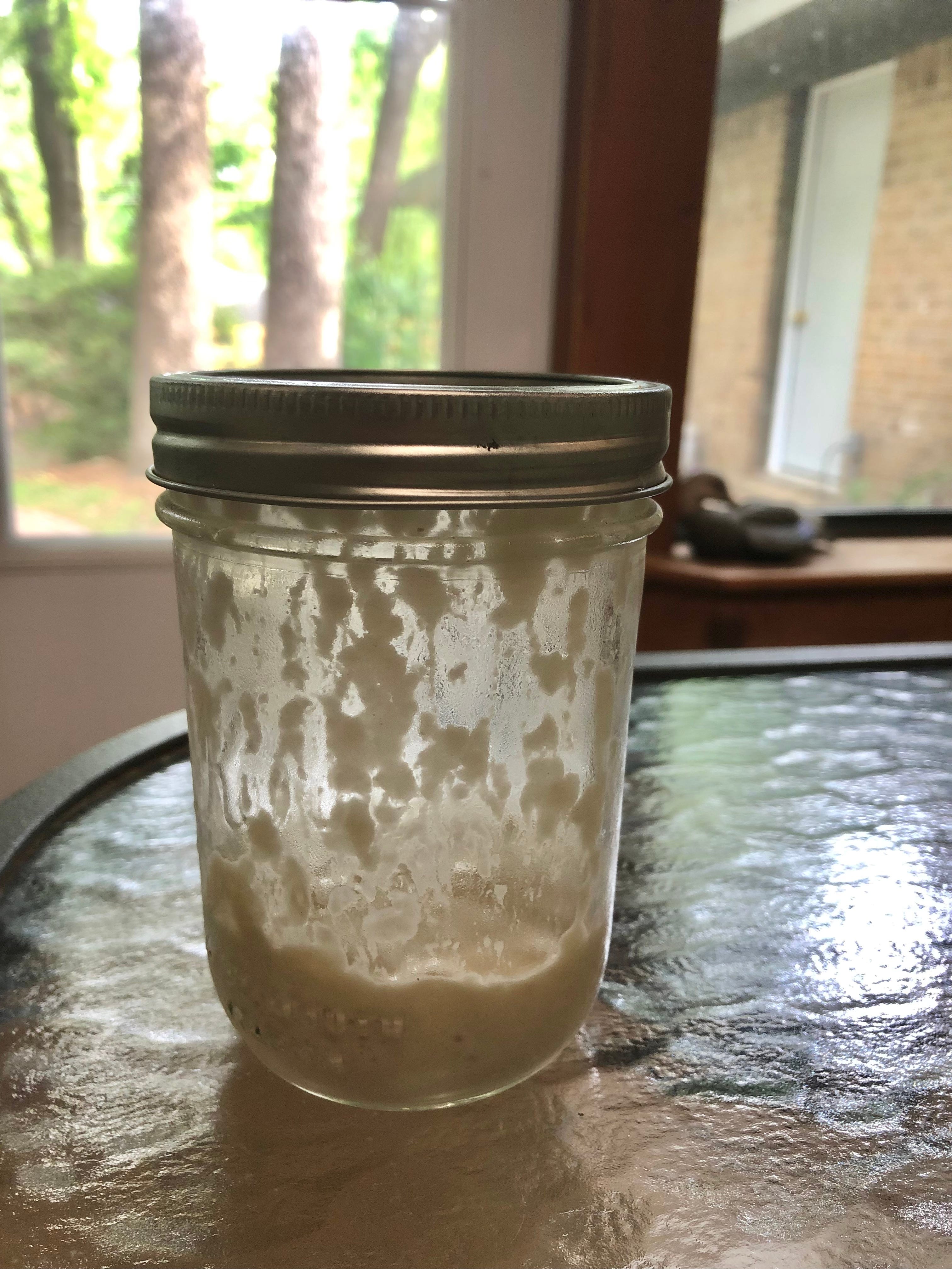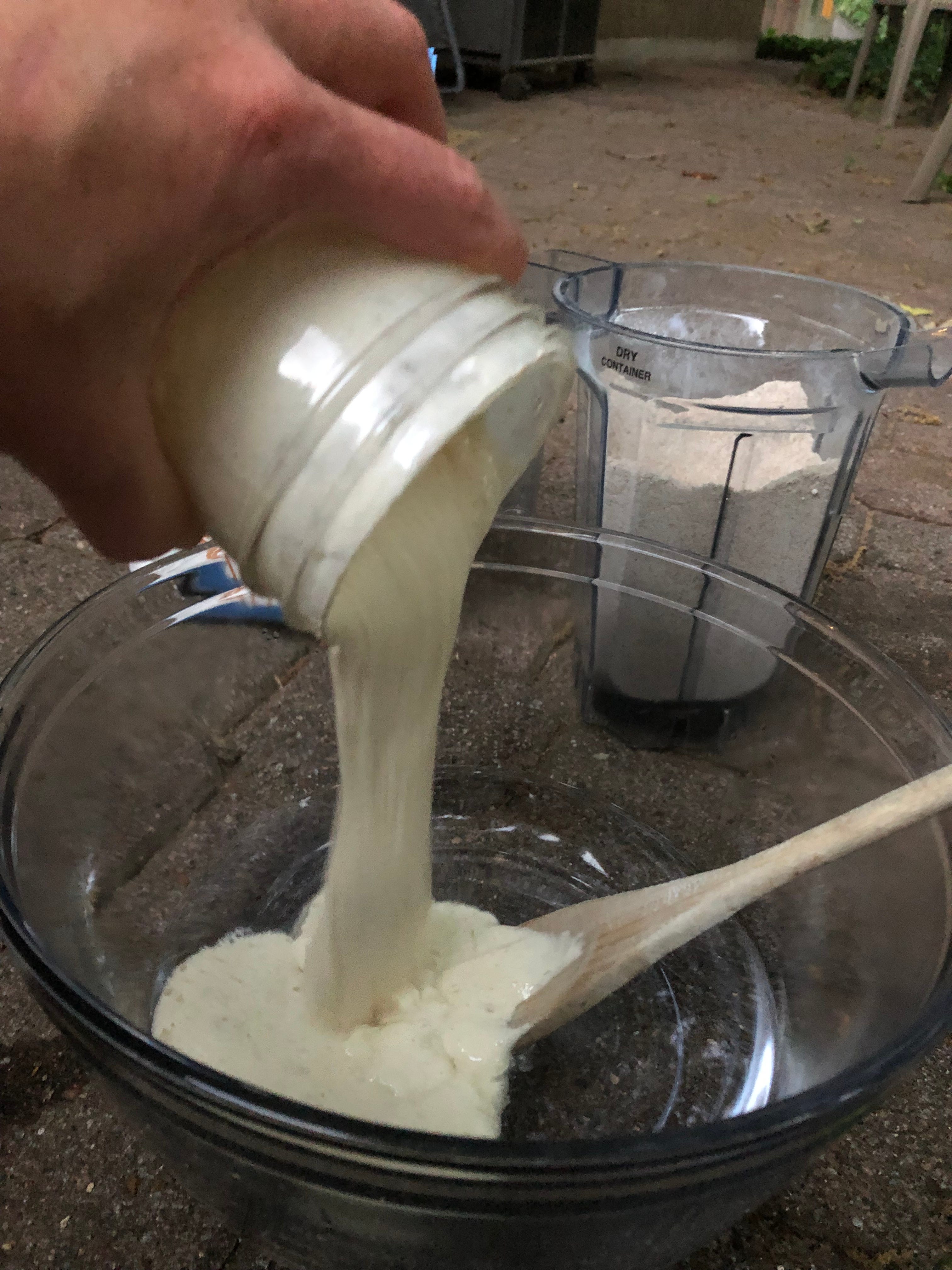 1300-ish: I’m in the kitchen getting lunch about this time. Eloise, my sourdough starter, lives in the fridge most of the time- typically consisting of about 1/4-1/2 a cup of starter in a pint size mason jar. I take Eloise out of the fridge, dump a bit less than a cup of organic bread flour (no measuring here- I just dump straight from the bag) into her jar, and then dispense about the same amount of filtered water directly from my Berkey filter. I use a clean fork to mix the flour, water, and starter into a thickish slurry- not runny, but not clumpy. The jar is half full at this point. I replace the lid, leave Eloise to do her thing on the counter, have my lunch, and go about my day.