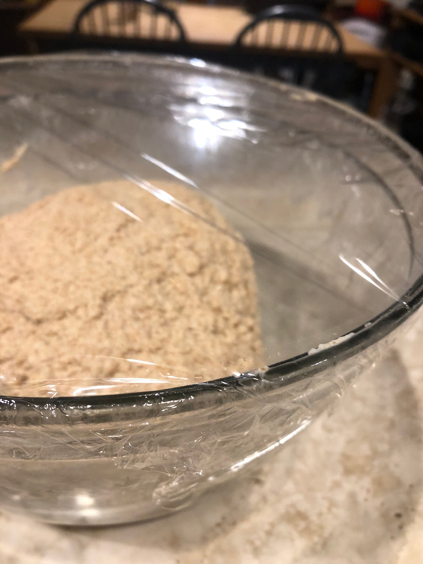 Now, since my hands are doughy, I’ll wash them off, also washing any dishes in the sink while I’m there. Before drying my hands off, I run a wet finger around the edge of my bread bowl so that plastic wrap will stick properly. I cover the bowl and set it aside for the night. If it’s cold out, I’ll leave it on the counter; if it’s warm, I’ll put it in the fridge so it doesn’t over proof.