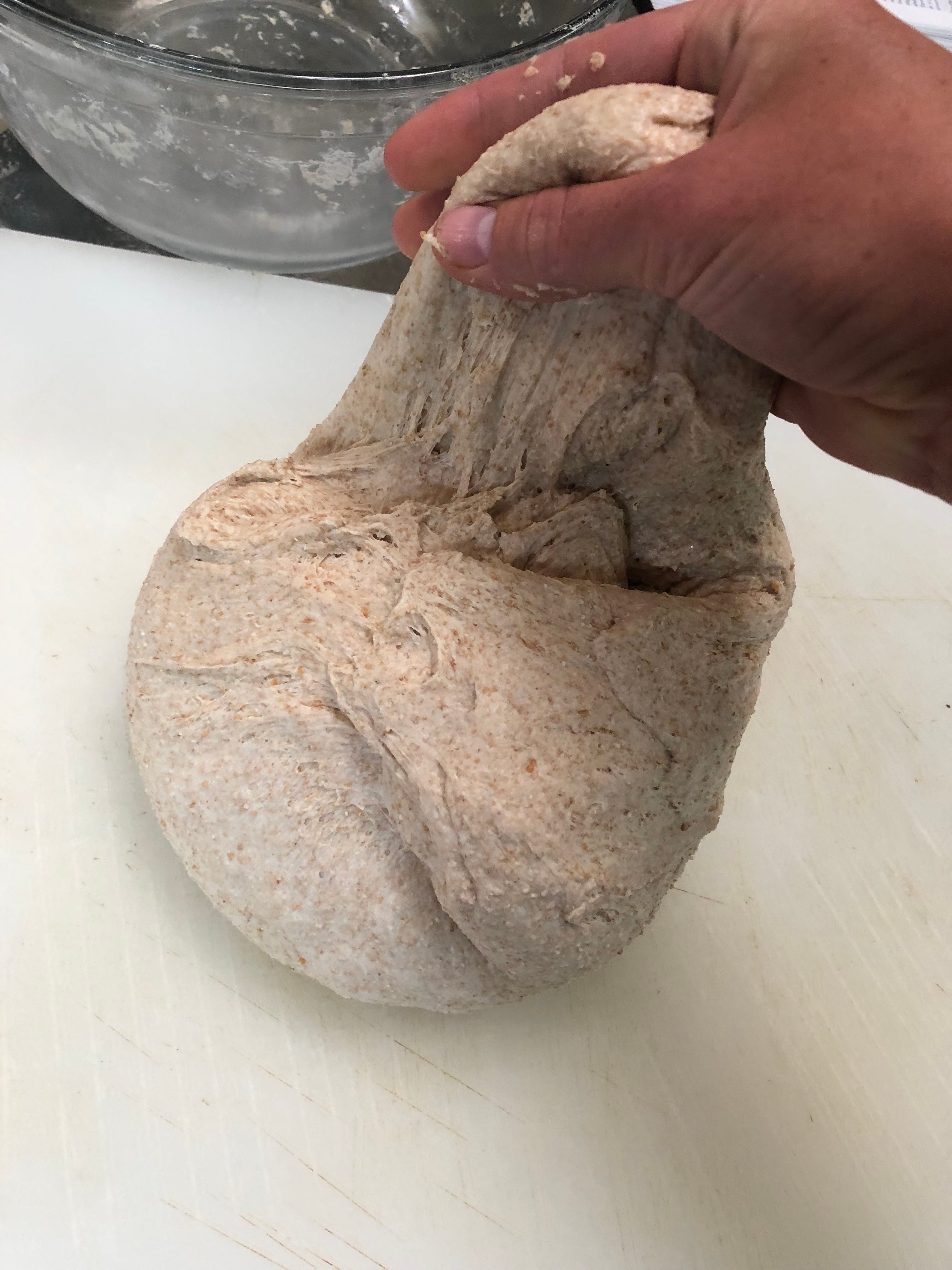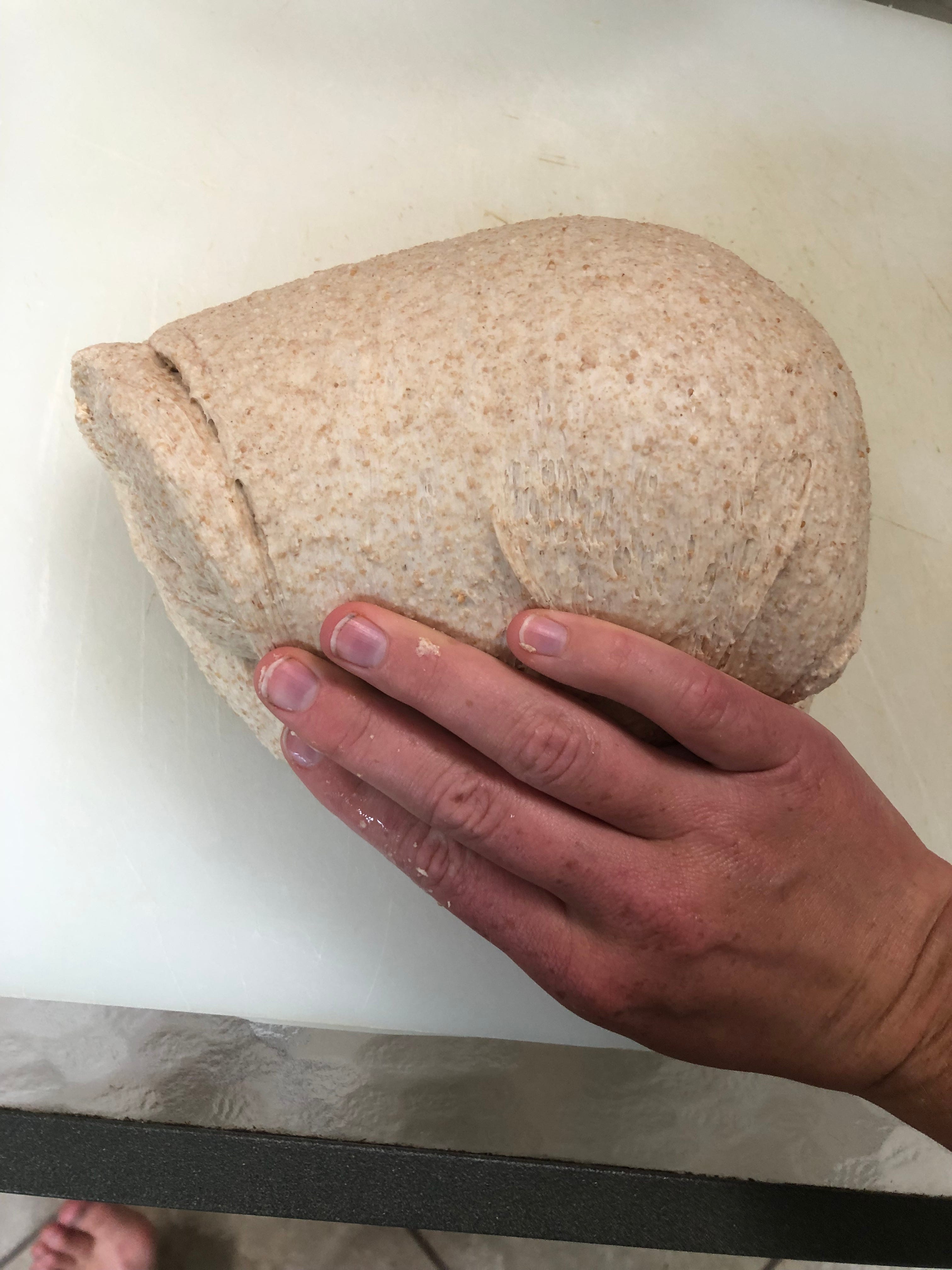 The following morning: When I hit the kitchen again to make breakfast and coffee, around 0700, I pull the dough out of the fridge to warm up. I’ll stretch and fold it again once it’s reached room temperature; I’ve noticed that it’s quite stiff when I try to work with it cold, and that causes it to tear rather than stretch nicely. For a loaf this size, that may take an hour or so. If I have to work that morning (I’m a part time receptionist), I may even wait until lunchtime when I get home to stretch and fold it. That’s alright- it’s a flexible process.