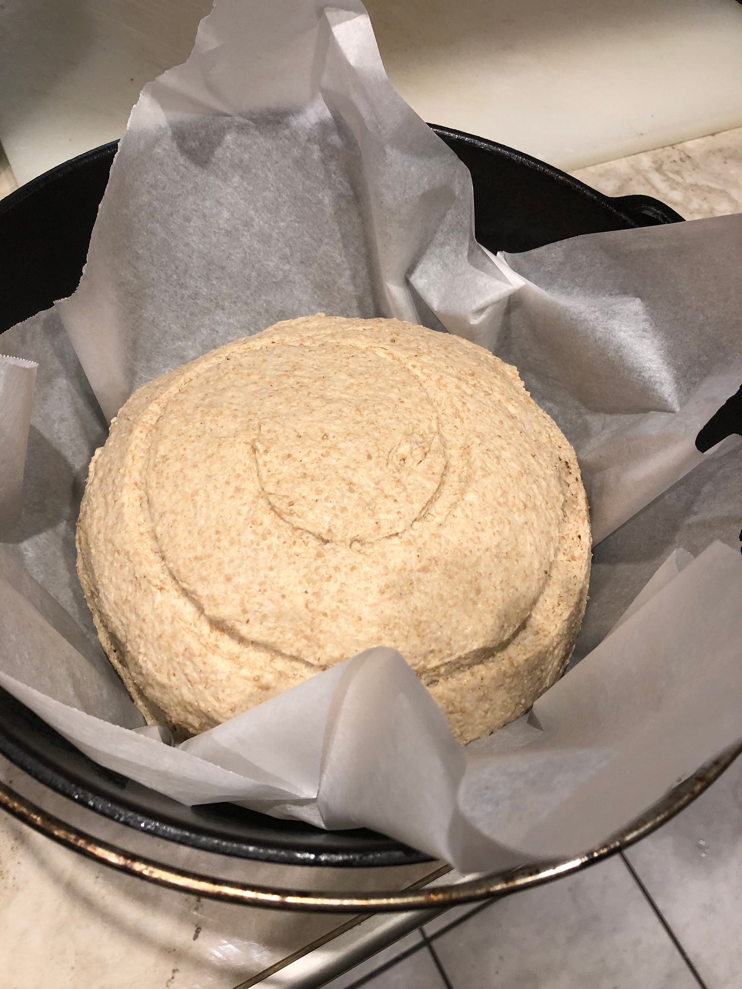 Once the Dutch oven is preheated, I tear a square of parchment paper, put the dough on it, and score it with a sharp knife. Sometimes I’ll dust it with bread flour prior to scoring to make it prettier… You can get as creative as you’d like (or keep it as simple as you’d like) with the scoring. I then lift the parchment paper and dough into the piping hot Dutch oven, replace the lid, and bake it at 450 for 30 minutes. After 30 minutes, I remove the lid and bake for another 10 minutes.